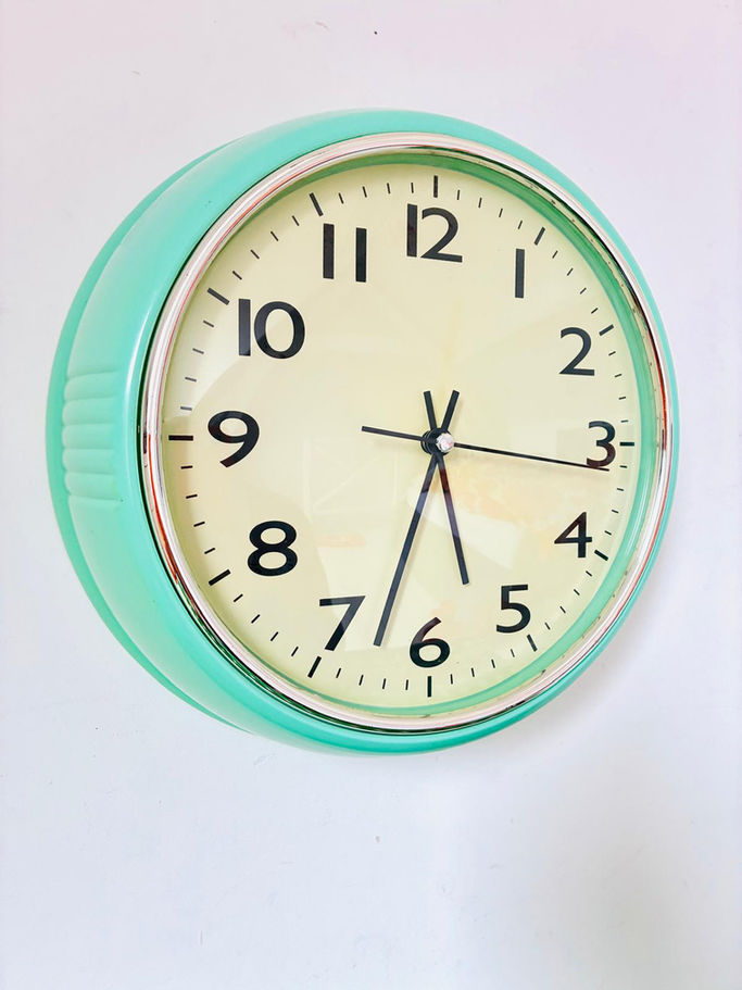 Très belle horloge rétro en plastique mint, turquoise clair.