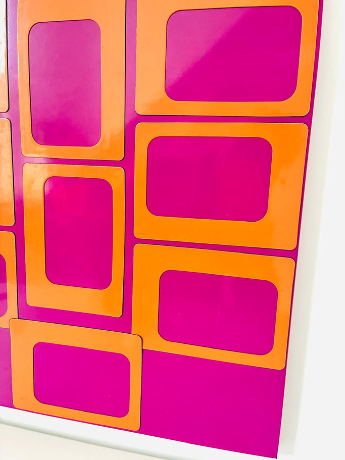 Tableau en métal laqué violet avec 9 cadres aimantés oranges esprit pop rétro seventies 79’s.